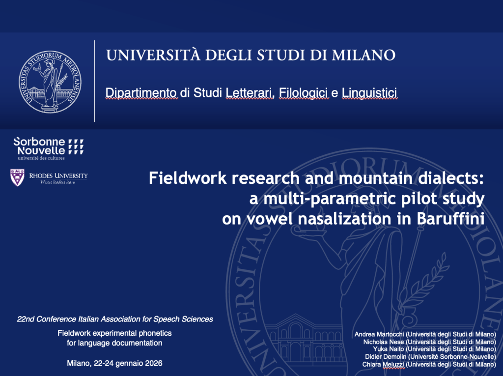 Martocchi, A., Nese, N., Naito, Y., Demolin, D., Meluzzi, C. (2026). Fieldwork research and mountain dialects: a multi-parametric pilot study on vowel nasalization in Baruffini. XXII AISV Annual Conference. January 2026. Milan, University of Milan, Italy. [Talk]- Peer-reviewed abstract
