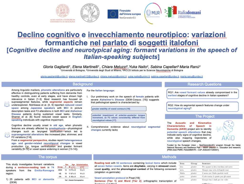Gagliardi, G., Martinelli, E., Meluzzi, C., Naito, Y., Capellari, S. & Ranù, M. (2025) Declino cognitivo e invecchiamento neurotipico: variazioni formantiche nel parlato di soggetti italofoni. Tra medici e linguisti 5: tra ‘rumore’ e disfluenza. Dicembre 2025. Napoli, Università di Napoli “Federico II”. [Poster]