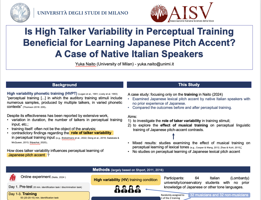 Naito, Y. (2026) Is high talker variability in perceptual training beneficial for the learning of Japanese pitch accent? A case of native Italian speakers. XXII convegno annuale AISV. Gennaio 2026. Milano, Università degli Studi di Milano. [Poster]- Peer-reviewed abstract